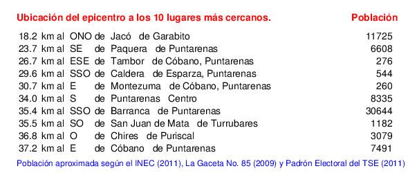 Mapa de la zona epicentral. Se muestran las poblaciones más cercanas al epicentro y fallas activas. Abajo están las distancias que hay del epicentro a cada uno de los diez sitios más cercanos y la cantidad de habitantes que poseen.
