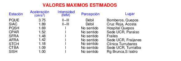 Intensidades en sitios de registro.Cada uno de los cuadrados en el mapa corresponde a la ubicación de un acelerógrafo al momento del sismo. Estos se muestran en distintos colores según la escala mostrada al pie de la figura.