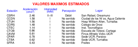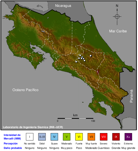 Intensidades en sitios de registro.Cada uno de los cuadrados en el mapa corresponde a la ubicación de un acelerógrafo al momento del sismo. Estos se muestran en distintos colores según la escala mostrada al pie de la figura.