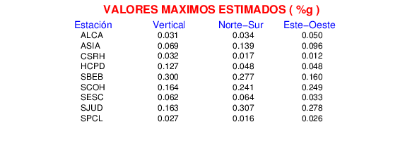 La siguiente tabla muestra los datos de aceleración máxima para cada componente en porcentaje de la aceleración de la gravedad (%g). Estos se obtienen dividiendo el valor del PGA registrado por 980 cm/s2 y multiplicándolo por 100.