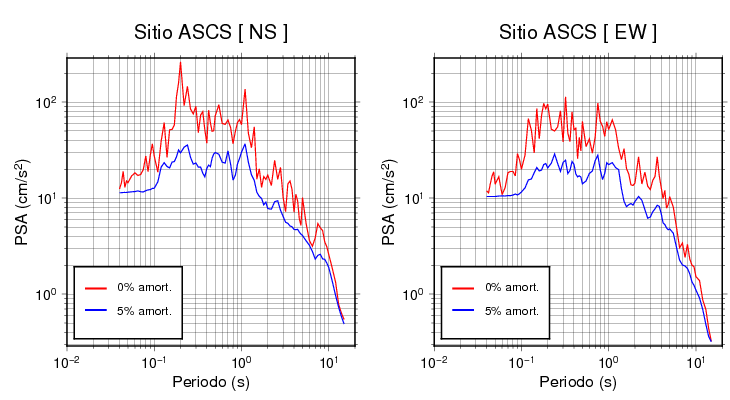 Las construcciones civiles generalmente poseen niveles de amortiguamiento en el rango de 2 a 7%. Para edificaciones normales, se asume que es de 5%. Esta tabla contiene los valores de PSA en cm/s2 calculados del espectro de respuesta con 5% de amortiguamiento a 1 segundo (se muestran los valores para aquellas estaciones que tuvieron un valor de aceleración superior a 5 cm/s2).