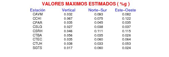 La siguiente tabla muestra los datos de aceleración máxima para cada componente en porcentaje de la aceleración de la gravedad (%g). Estos se obtienen dividiendo el valor del PGA registrado por 980 cm/s2 y multiplicándolo por 100.