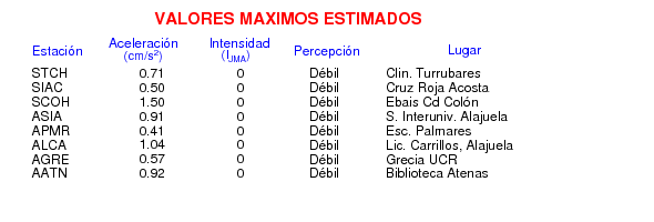 Intensidades en sitios de registro.Cada uno de los cuadrados en el mapa corresponde a la ubicación de un acelerógrafo al momento del sismo. Estos se muestran en distintos colores según la escala mostrada al pie de la figura.