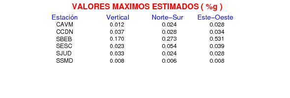 La siguiente tabla muestra los datos de aceleración máxima para cada componente en porcentaje de la aceleración de la gravedad (%g). Estos se obtienen dividiendo el valor del PGA registrado por 980 cm/s2 y multiplicándolo por 100.