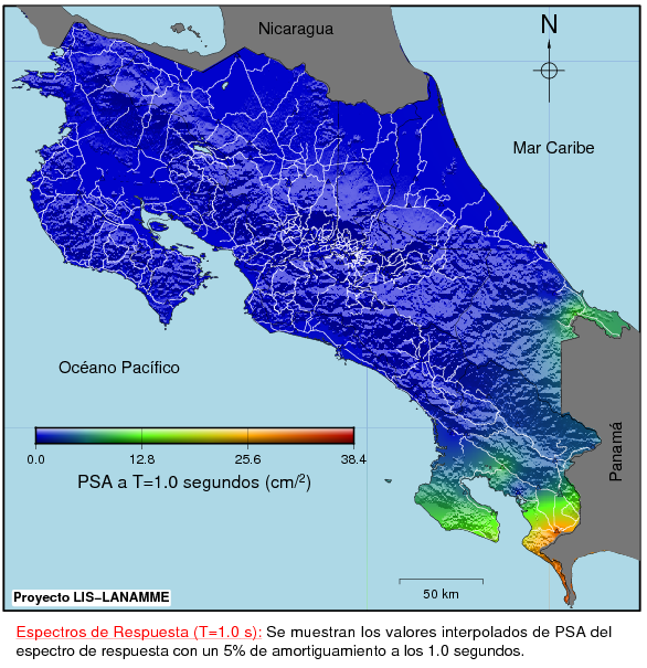 La siguiente figura corresponde al mapa interpolado de los valores de los espectros de respuesta para 1.0 s en período. La escala muestra los valores de pseudoaceleración con los valores bajos en azul y los altos en rojo. Los triángulos corresponden a la ubicación de los acelerógrafos.