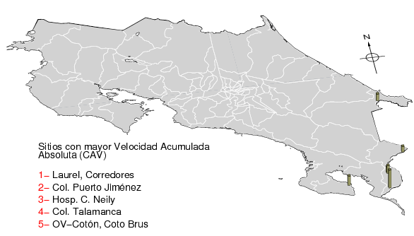 La velocidad acumulada absoluta (CAV por sus siglas en inglés) es otro parámetro que se usa para caracterizar el movimiento fuerte del suelo. Los datos están dados en cm/s para las componentes norte-sur (NS) y este-oeste (EW). El máximo de ambas se da en la tercera columna.