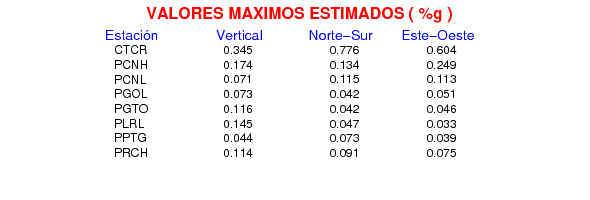 La siguiente tabla muestra los datos de aceleración máxima para cada componente en porcentaje de la aceleración de la gravedad (%g). Estos se obtienen dividiendo el valor del PGA registrado por 980 cm/s2 y multiplicándolo por 100.