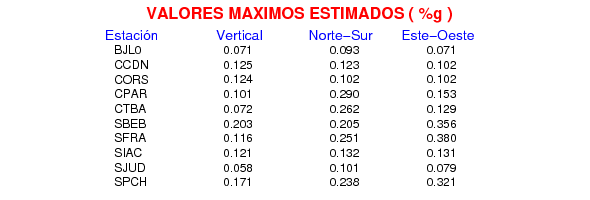 La siguiente tabla muestra los datos de aceleración máxima para cada componente en porcentaje de la aceleración de la gravedad (%g). Estos se obtienen dividiendo el valor del PGA registrado por 980 cm/s2 y multiplicándolo por 100.