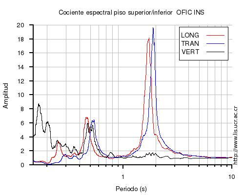 También se muestra el cociente espectral (en el rango de 0.1 a 10 s) entre el nivel superior (sea el último piso o la azotea) e inferior (sea el primero piso o el sótano) para cada una de las componentes LONG=longitudinal, TRAN=transversal y VERT=vertical. En los casos en que el nivel superior o inferior no estén disponibles al momento del sismo, se muestra una imagen con la leyenda "No se pudo calcular".
