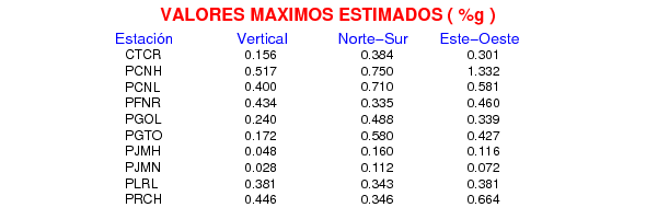 La siguiente tabla muestra los datos de aceleración máxima para cada componente en porcentaje de la aceleración de la gravedad (%g). Estos se obtienen dividiendo el valor del PGA registrado por 980 cm/s2 y multiplicándolo por 100.