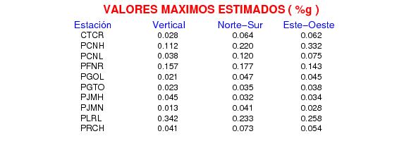 La siguiente tabla muestra los datos de aceleración máxima para cada componente en porcentaje de la aceleración de la gravedad (%g). Estos se obtienen dividiendo el valor del PGA registrado por 980 cm/s2 y multiplicándolo por 100.