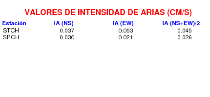 En esta sección se muestra el cáculo de la IA para la componente norte-sur (NS) y este-oeste (EW) de los registros de aceleración que tuvieron valores superiores a los 5 cm/s2, así como el valor total de esta que corresponde al promedio de ambas componentes horizontales.