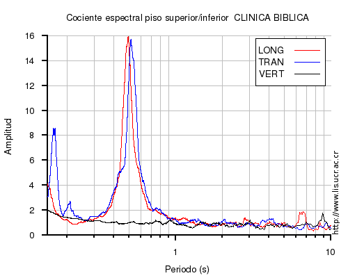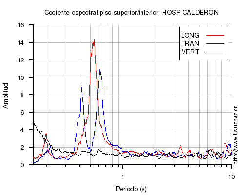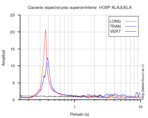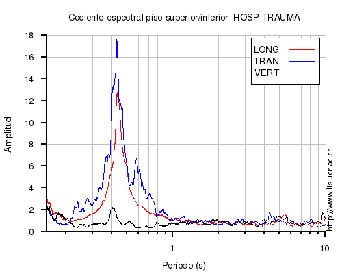 También se muestra el cociente espectral (en el rango de 0.1 a 10 s) entre el nivel superior (sea el último piso o la azotea) e inferior (sea el primero piso o el sótano) para cada una de las componentes LONG=longitudinal, TRAN=transversal y VERT=vertical. En los casos en que el nivel superior o inferior no estén disponibles al momento del sismo, se muestra una imagen con la leyenda "No se pudo calcular".