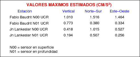 Aquí se muestran las formas de onda y cocientes espectrales de los sensores colocados en pozo . Uno se ubica en el Jardín Lankester en Paraíso de Cartago con 30 m de profundidad y el otro en la Estación Experimental Fabio Baudrit en Alajuela con 40 m de profundidad. La tabla muestra los valores de aceleración máxima (PGA) leídos de las tres componentes en superficie (N00) y en profundidad (N01)
