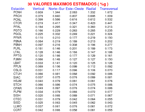 La siguiente tabla muestra los datos de aceleración máxima para cada componente en porcentaje de la aceleración de la gravedad (%g). Estos se obtienen dividiendo el valor del PGA registrado por 980 cm/s2 y multiplicándolo por 100. Los valores de las últimas dos columnas corresponden a la componente radial y transversal. Los datos se listan en orden descendente según el valor de la componente radial.