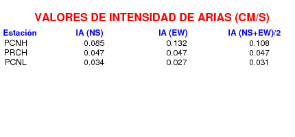 En esta sección se muestra el cáculo de la IA para la componente norte-sur (NS) y este-oeste (EW) de los registros de aceleración que tuvieron valores superiores a los 5 cm/s2, así como el valor total de esta que corresponde al promedio de ambas componentes horizontales.