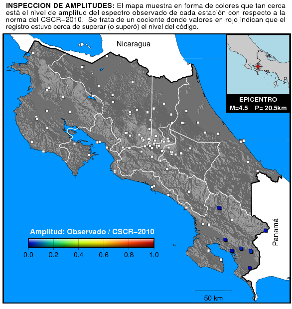 El siguiente mapa muestra de manera resumida qué tan cerca estuvo la amplitud del espectro de respuesta de cada estación de superar el nivel del espectro de diseño del CSCR-2010. El cálculo consiste en comparar periodo a periodo la amplitud del espectro observado con el nivel propuesto por el código en cada sitio para el tipo de suelo y zona sísmica correspondiente.