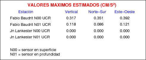 Aquí se muestran las formas de onda y cocientes espectrales de los sensores colocados en pozo . Uno se ubica en el Jardín Lankester en Paraíso de Cartago con 30 m de profundidad y el otro en la Estación Experimental Fabio Baudrit en Alajuela con 40 m de profundidad. La tabla muestra los valores de aceleración máxima (PGA) leídos de las tres componentes en superficie (N00) y en profundidad (N01)