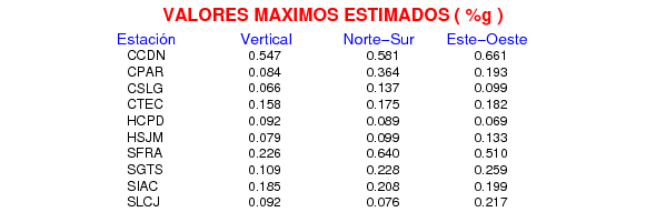 La siguiente tabla muestra los datos de aceleración máxima para cada componente en porcentaje de la aceleración de la gravedad (%g). Estos se obtienen dividiendo el valor del PGA registrado por 980 cm/s2 y multiplicándolo por 100.