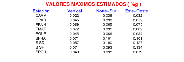 La siguiente tabla muestra los datos de aceleración máxima para cada componente en porcentaje de la aceleración de la gravedad (%g). Estos se obtienen dividiendo el valor del PGA registrado por 980 cm/s2 y multiplicándolo por 100.