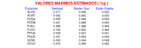 La siguiente tabla muestra los datos de aceleración máxima para cada componente en porcentaje de la aceleración de la gravedad (%g). Estos se obtienen dividiendo el valor del PGA registrado por 980 cm/s2 y multiplicándolo por 100.