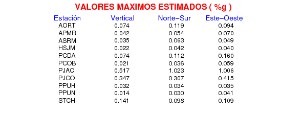 La siguiente tabla muestra los datos de aceleración máxima para cada componente en porcentaje de la aceleración de la gravedad (%g). Estos se obtienen dividiendo el valor del PGA registrado por 980 cm/s2 y multiplicándolo por 100.
