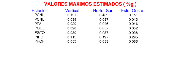 La siguiente tabla muestra los datos de aceleración máxima para cada componente en porcentaje de la aceleración de la gravedad (%g). Estos se obtienen dividiendo el valor del PGA registrado por 980 cm/s2 y multiplicándolo por 100.
