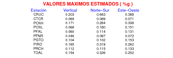 La siguiente tabla muestra los datos de aceleración máxima para cada componente en porcentaje de la aceleración de la gravedad (%g). Estos se obtienen dividiendo el valor del PGA registrado por 980 cm/s2 y multiplicándolo por 100.