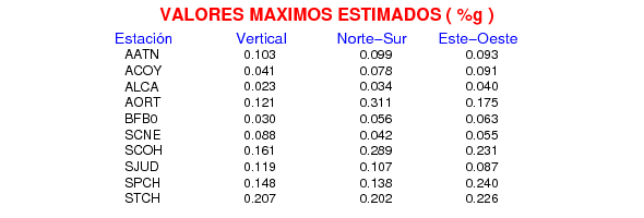 La siguiente tabla muestra los datos de aceleración máxima para cada componente en porcentaje de la aceleración de la gravedad (%g). Estos se obtienen dividiendo el valor del PGA registrado por 980 cm/s2 y multiplicándolo por 100.