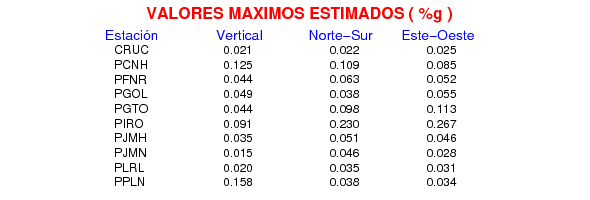 La siguiente tabla muestra los datos de aceleración máxima para cada componente en porcentaje de la aceleración de la gravedad (%g). Estos se obtienen dividiendo el valor del PGA registrado por 980 cm/s2 y multiplicándolo por 100.