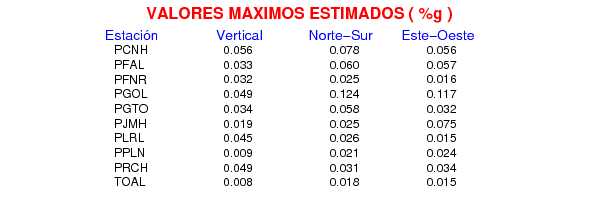 La siguiente tabla muestra los datos de aceleración máxima para cada componente en porcentaje de la aceleración de la gravedad (%g). Estos se obtienen dividiendo el valor del PGA registrado por 980 cm/s2 y multiplicándolo por 100.