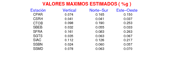 La siguiente tabla muestra los datos de aceleración máxima para cada componente en porcentaje de la aceleración de la gravedad (%g). Estos se obtienen dividiendo el valor del PGA registrado por 980 cm/s2 y multiplicándolo por 100.