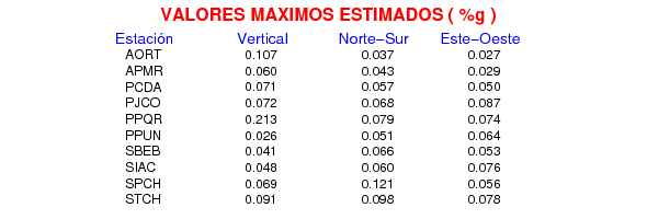 La siguiente tabla muestra los datos de aceleración máxima para cada componente en porcentaje de la aceleración de la gravedad (%g). Estos se obtienen dividiendo el valor del PGA registrado por 980 cm/s2 y multiplicándolo por 100.