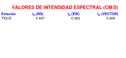 En esta sección se muestra el cáculo de la intensidad de Housner, IH para la componente norte-sur (NS) y este-oeste (EW) y la suma vectorial de los registros de aceleración que tuvieron valores superiores a los 5 cm/s2.