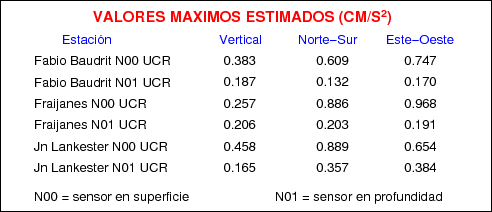 Aquí se muestran las formas de onda y cocientes espectrales de los sensores colocados en pozo . Uno se ubica en el Jardín Lankester en Paraíso de Cartago con 30 m de profundidad y el otro en la Estación Experimental Fabio Baudrit en Alajuela con 40 m de profundidad. La tabla muestra los valores de aceleración máxima (PGA) leídos de las tres componentes en superficie (N00) y en profundidad (N01)