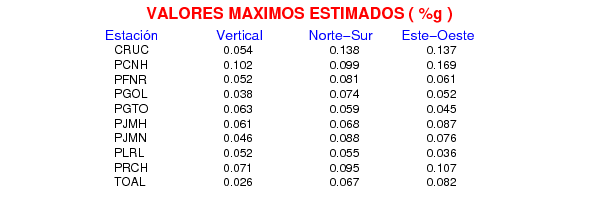 La siguiente tabla muestra los datos de aceleración máxima para cada componente en porcentaje de la aceleración de la gravedad (%g). Estos se obtienen dividiendo el valor del PGA registrado por 980 cm/s2 y multiplicándolo por 100.