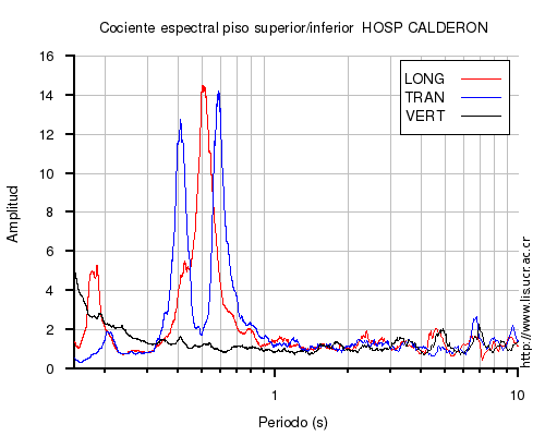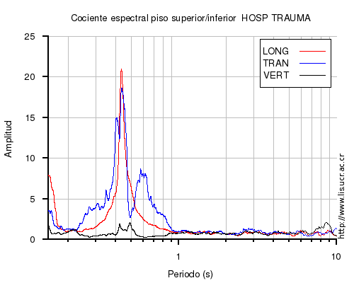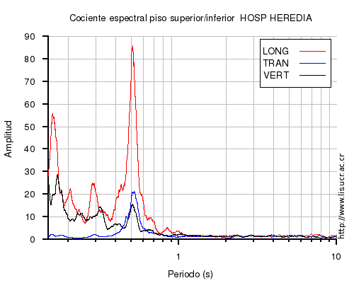 También se muestra el cociente espectral (en el rango de 0.1 a 10 s) entre el nivel superior (sea el último piso o la azotea) e inferior (sea el primero piso o el sótano) para cada una de las componentes LONG=longitudinal, TRAN=transversal y VERT=vertical. En los casos en que el nivel superior o inferior no estén disponibles al momento del sismo, se muestra una imagen con la leyenda "No se pudo calcular".