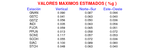 La siguiente tabla muestra los datos de aceleración máxima para cada componente en porcentaje de la aceleración de la gravedad (%g). Estos se obtienen dividiendo el valor del PGA registrado por 980 cm/s2 y multiplicándolo por 100.