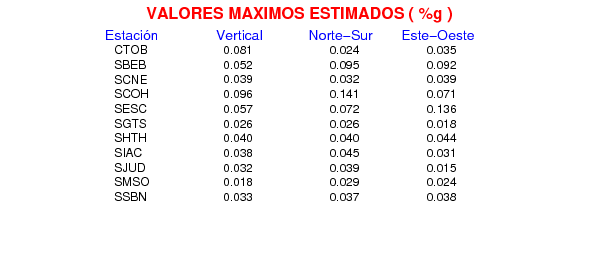 La siguiente tabla muestra los datos de aceleración máxima para cada componente en porcentaje de la aceleración de la gravedad (%g). Estos se obtienen dividiendo el valor del PGA registrado por 980 cm/s2 y multiplicándolo por 100.
