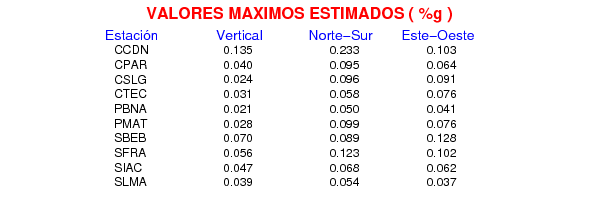 La siguiente tabla muestra los datos de aceleración máxima para cada componente en porcentaje de la aceleración de la gravedad (%g). Estos se obtienen dividiendo el valor del PGA registrado por 980 cm/s2 y multiplicándolo por 100.