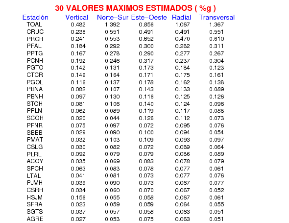 La siguiente tabla muestra los datos de aceleración máxima para cada componente en porcentaje de la aceleración de la gravedad (%g). Estos se obtienen dividiendo el valor del PGA registrado por 980 cm/s2 y multiplicándolo por 100. Los valores de las últimas dos columnas corresponden a la componente radial y transversal. Los datos se listan en orden descendente según el valor de la componente radial.