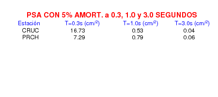 Esta tabla contiene los valores de PSA en cm/s2 calculados del espectro de respuesta con 5% de amortiguamiento a 1 segundo (se muestran los valores para aquellas estaciones que tuvieron un valor de aceleración superior a 5 cm/s2).