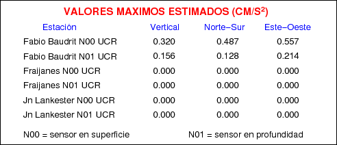 Aquí se muestran las formas de onda y cocientes espectrales de los sensores colocados en pozo . Uno se ubica en el Jardín Lankester en Paraíso de Cartago con 30 m de profundidad y el otro en la Estación Experimental Fabio Baudrit en Alajuela con 40 m de profundidad. La tabla muestra los valores de aceleración máxima (PGA) leídos de las tres componentes en superficie (N00) y en profundidad (N01)