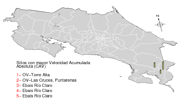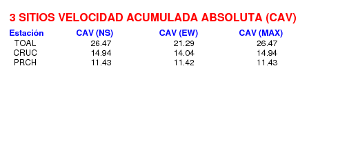 La velocidad acumulada absoluta (CAV por sus siglas en inglés) es otro parámetro que se usa para caracterizar el movimiento fuerte del suelo. Los datos están dados en cm/s para las componentes norte-sur (NS) y este-oeste (EW). El máximo de ambas se da en la tercera columna.