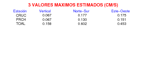 Los registros de velocidad se obtienen de la integración de los datos de aceleración. Esta tabla contiene los valores de velocidad máxima (PGV por sus siglas en inglés) para cada componente en cm/s. Las estaciones se listan en orden alfabético y corresponden a los sitios en que el nivel de aceleración fue superior a los 5 cm/s2.