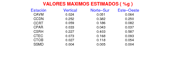 La siguiente tabla muestra los datos de aceleración máxima para cada componente en porcentaje de la aceleración de la gravedad (%g). Estos se obtienen dividiendo el valor del PGA registrado por 980 cm/s2 y multiplicándolo por 100.