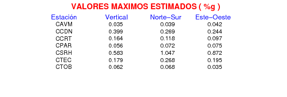 La siguiente tabla muestra los datos de aceleración máxima para cada componente en porcentaje de la aceleración de la gravedad (%g). Estos se obtienen dividiendo el valor del PGA registrado por 980 cm/s2 y multiplicándolo por 100.