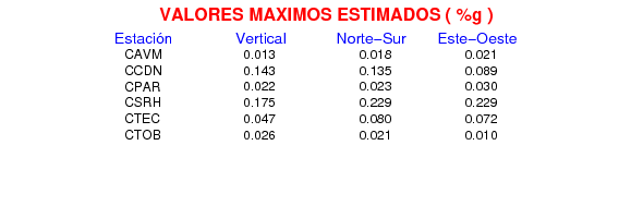 La siguiente tabla muestra los datos de aceleración máxima para cada componente en porcentaje de la aceleración de la gravedad (%g). Estos se obtienen dividiendo el valor del PGA registrado por 980 cm/s2 y multiplicándolo por 100.