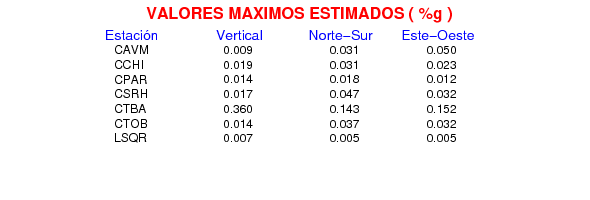 La siguiente tabla muestra los datos de aceleración máxima para cada componente en porcentaje de la aceleración de la gravedad (%g). Estos se obtienen dividiendo el valor del PGA registrado por 980 cm/s2 y multiplicándolo por 100.