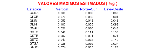 La siguiente tabla muestra los datos de aceleración máxima para cada componente en porcentaje de la aceleración de la gravedad (%g). Estos se obtienen dividiendo el valor del PGA registrado por 980 cm/s2 y multiplicándolo por 100.